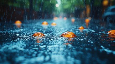 Fresh oranges float on a wet street, droplets dancing in the evening light.
