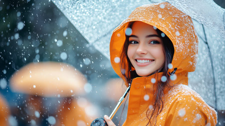 Cheerful Happy positive woman in raincoat. Lady street joy rainy weather. Generate ai