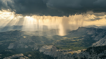 This stunning image showcases a rich mountain landscape during a rainstorm, with dramatic sunlight piercing through dark clouds and illuminating the terrain.