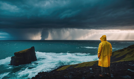 A person in a yellow raincoat stands on a cliff overlooking the ocean as a storm rages in the distance