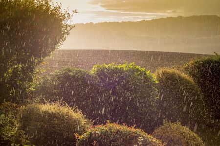 Rain falling on forest and field