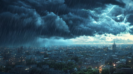 Detailed view of a summer storm with torrential rain and thunderclouds, showing a cityscape affected by the heavy weather and darkening skies.