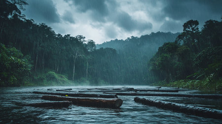 A moody and atmospheric shot of a heavy rainstorm in a lush, dense forest. Silhouetted trees frame the view, with raindrops creating a blurry, wet effect.