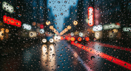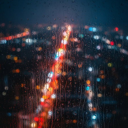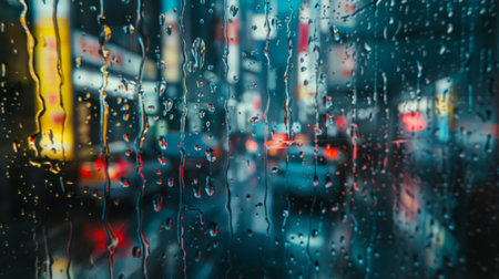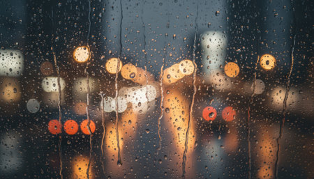 Raindrops on glass create a moody atmosphere at night with glowing city lights in the background