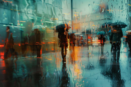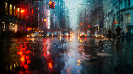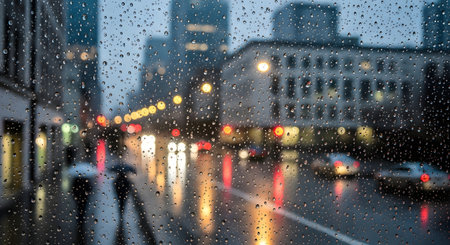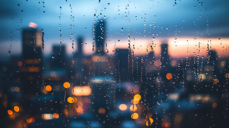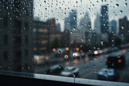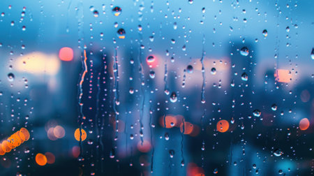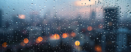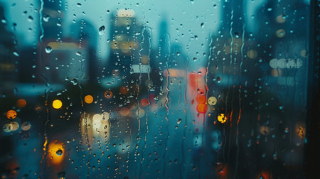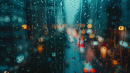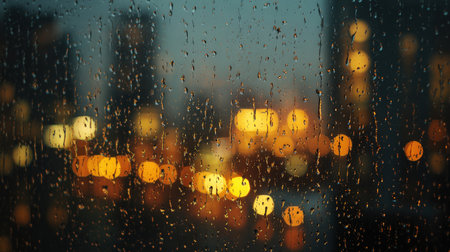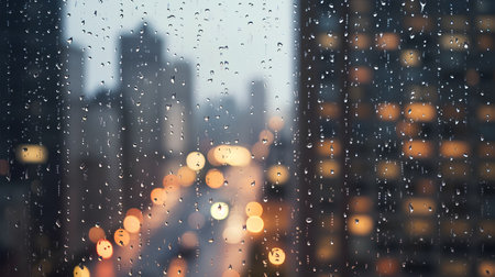 Scenic rainy day with raindrops falling on a windowpane, creating a blurred, view of a cityscape