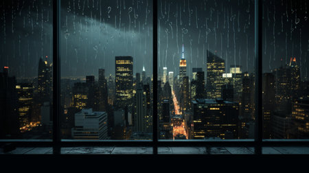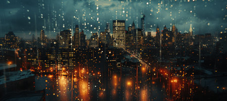 Captivating rainy cityscape at night seen through wet glass, showcasing an urban skyline illuminated by soft lights, creating a serene and tranquil atmosphere.