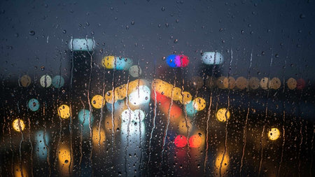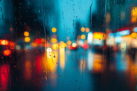 Rain on window with colorful city lights blurred in bokeh, capturing the essence of a rainy urban night.
