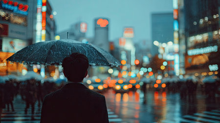 A contemplative man stands with an umbrella on a rainy city street, surrounded by blurred lights and raindrops on glass, capturing a serene, moody atmosphere.