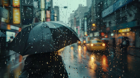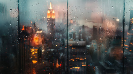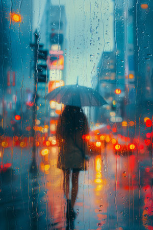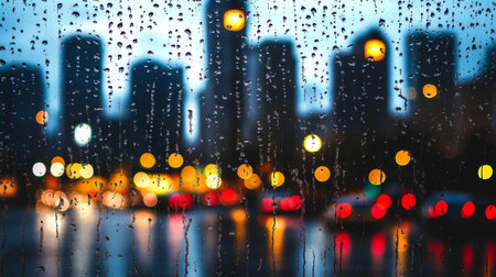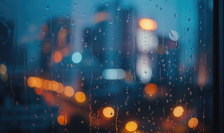 Raindrops create a beautiful effect on the glass, with the city lights blurred in the background, creating a dreamy atmosphere.