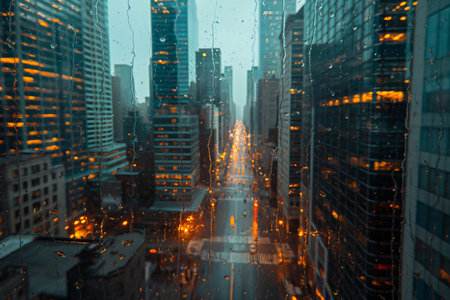 Moody cityscape photography rainfall creates a dreamy atmosphere with blurred buildings