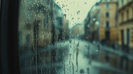 Raindrops trickle down the window glass, offering a blurred view of an empty street on a quiet rainy day, inviting calm reflections.