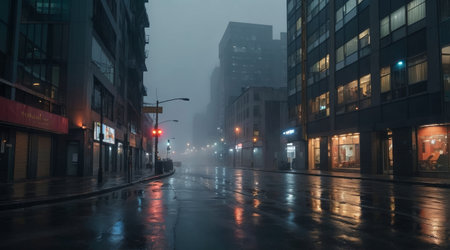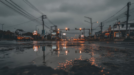 A captivating urban scene captures the reflections of city lights on a wet street after rain. The moody atmosphere showcases traffic signals and gleaming asphalt.
