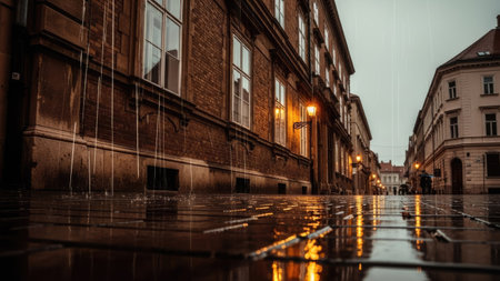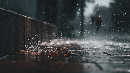 A captivating rain scene on a city street, showcasing unique water splashes and atmospheric mood. This image evokes a sense of tranquility and urban beauty.