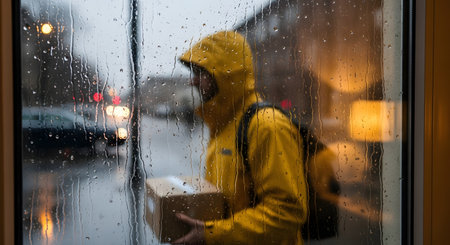 A delivery person wearing a yellow raincoat and carrying a cardboard package is seen through a window covered in raindrops. The moody image depicts parcel delivery services working in bad weather conditions.