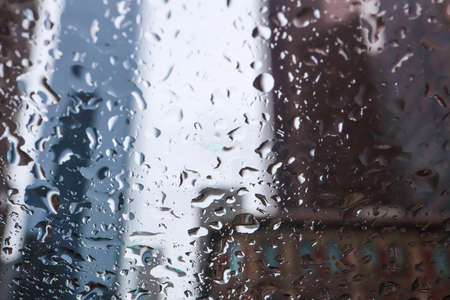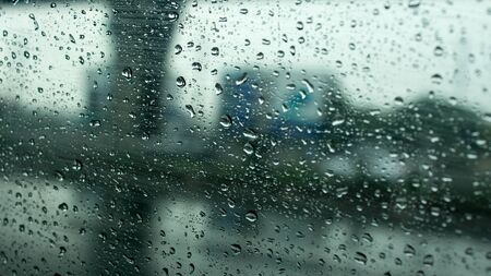 Rain drops on window glass with city view blurred background. Rainy weather concept