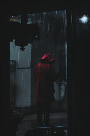 A silhouette of a man in a red raincoat and a red cap in the rain.