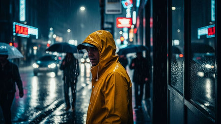 A solitary figure dressed in a bright yellow rain jacket walks through a rainy urban street. The moody backdrop captures a sense of isolation and reflection.