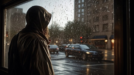 A person silhouette seen through a rainy window, abstract and artistic interpretation of urban isolation during a rainstorm