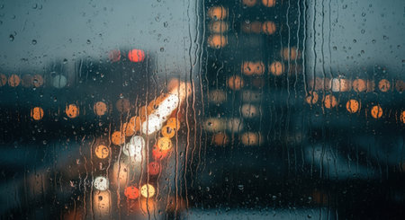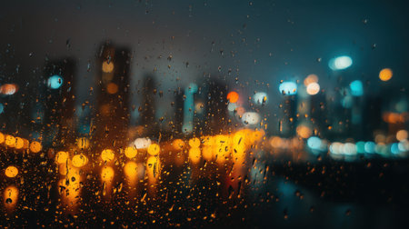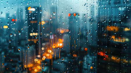 Raindrops cascading on a window with blurred city lights in the background, moody weather, capturing the essence of a rainy urban night