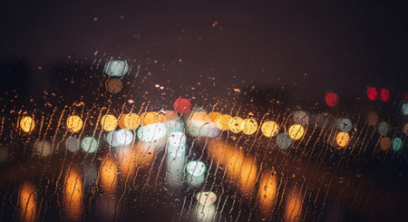 Rain on window with colorful city lights blurred in bokeh, capturing the essence of a rainy urban night.