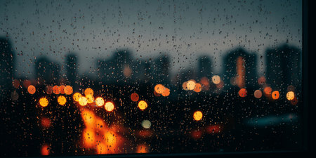 A stunning cityscape with bokeh effect and raindrop-speckled glass foreground