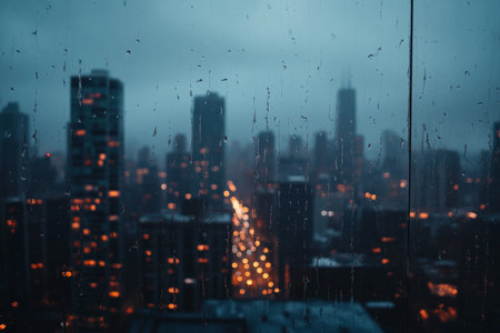 Moody rainfall over urban landscape blurred cityscape creating a melancholic ambiance