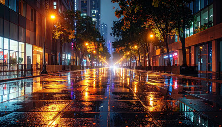 A nighttime scene depicts a rain-soaked urban environment. Illuminated streetlights cast a warm glow, reflecting off the wet pavement. Buildings and structures are visible in the background. The image has potential for various uses, including editorial and commercial projects.