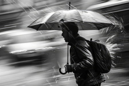 Pedestrian holding an umbrella walking in the rain, with rain drops in the foreground