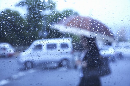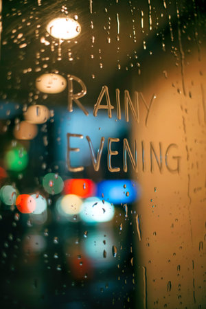 The rainy evening weather behind the window of the city.