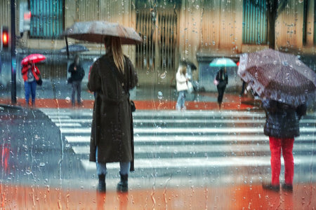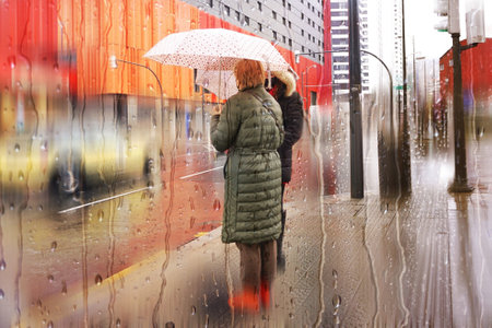 Abstract background of blurred young people walking down the street in rainy day. Raindrops on window glass. Intentional motion blur. Concept of modern urban lifestyle