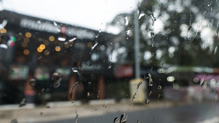 Rain drop on window glass of coffee shop and blurry city life background. Rainy season and blurry people city day life or bokeh night lights outside window. Coffee shop window covered with rain water