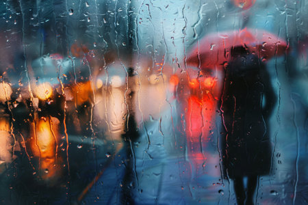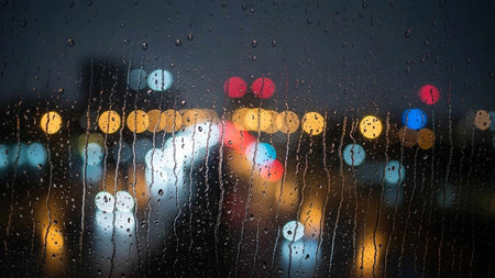 rain drops on glass with city lights blurred bokeh abstract background
