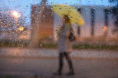 Abstract blurred silhouettes of people after rain in the city, girl in yellow seen through raindrops on window glass, blurred background. Concept of modern city.