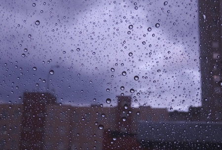 Drops of rain on the window. Rainy days in the city landscape. Defocused