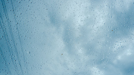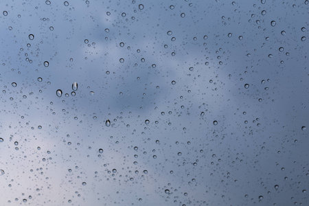 window raindrops on surface against blue cloudy sky after storm rainy weather