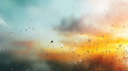 Close-up capture of rain drops on a glass window, showcasing a colorful background with a soft bokeh effect, enhancing the mood of tranquility and beauty.