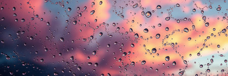 A stunning close-up capture of raindrops clinging to a window pane, showcasing a colorful sunset in the background that evokes feelings of tranquility and beauty.
