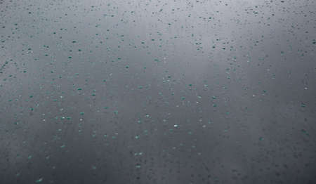 Rain drops on car's windshield in the blue rainy season in rainy city like Seattle, London or tropical equator plentiful countries, good for farming with dark cloud background and toned color and selective focus