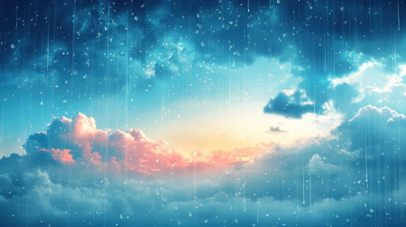 Rainy blue sky background with pink clouds in the center and sunlight illustration weather forecast concept with copy space