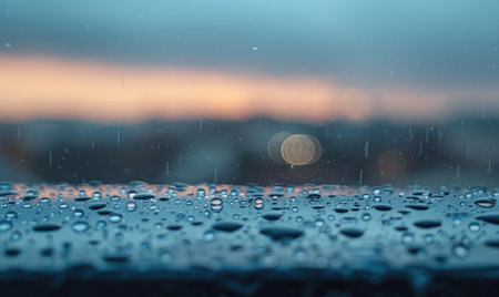 This captivating image features rain drops on a window with a vibrant sunset in the background, creating a serene and soothing atmosphere perfect for reflection.