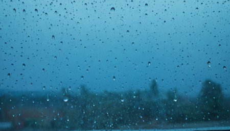 changeable weather concept, raindops on window glass with bokeh of serene blue sky with few clouds