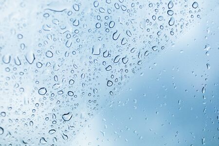 Abstract background of rain drops on glass on a background of blue bright sky
