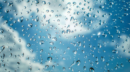 Glass with water droplets, blue sky backdrop, macro art, tranquil design, sharp detail. Style evokes natural serenity.
