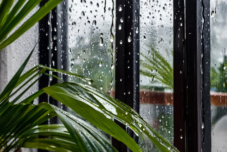 Abstract background with rain drops on window and palm leaves, blurred urban houses. Raindrops on glass for backgrounds rainy fall autumn weather. Outside window is blurred bokeh water of city