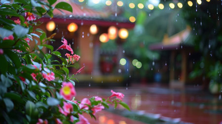 A peaceful temple with vibrant flowers and greenery blooming in the courtyard thanks to the monsoon rains