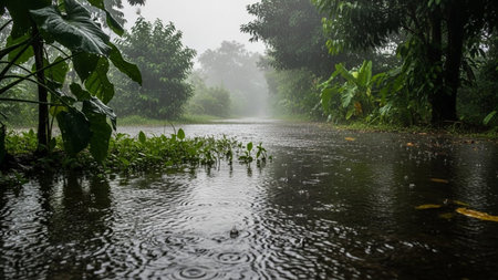 A tropical rainforest path during heavy rainfall, featuring lush green foliage and distinct water ripples on the wet...