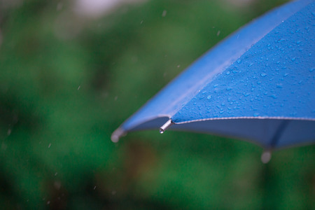 Wet colourful umbrella in rain with water drops. Rainy day - Rainy weather.