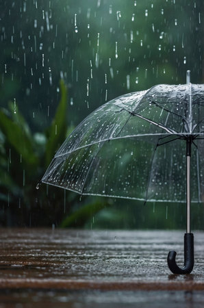 Clear umbrella protects against heavy rainfall on a wet wooden deck, with lush green foliage in the background, evoking a sense of calmness and protection Perfect for weather and nature themes.