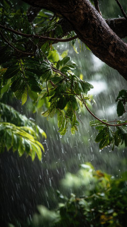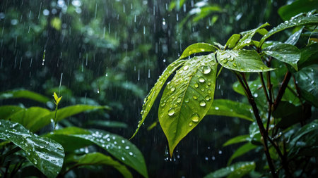 Rainfall drenching lush tropical foliage, with water droplets resting on vibrant green leaves, perfect for nature or environmental content, with copy space