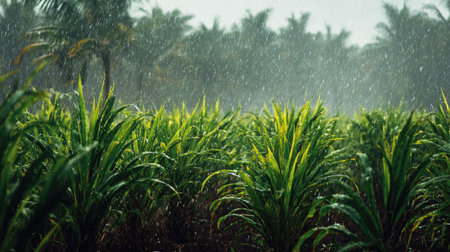 Captivating image showcasing rain falling gently on bright green leaves in a tranquil tropical garden, highlighting the serene beauty of nature during a refreshing shower.